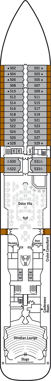 The silver spirit cruise ship cabins page is conveniently interlinked with its deck plans showing deck layouts combined with a legend and review of all onboard venues.